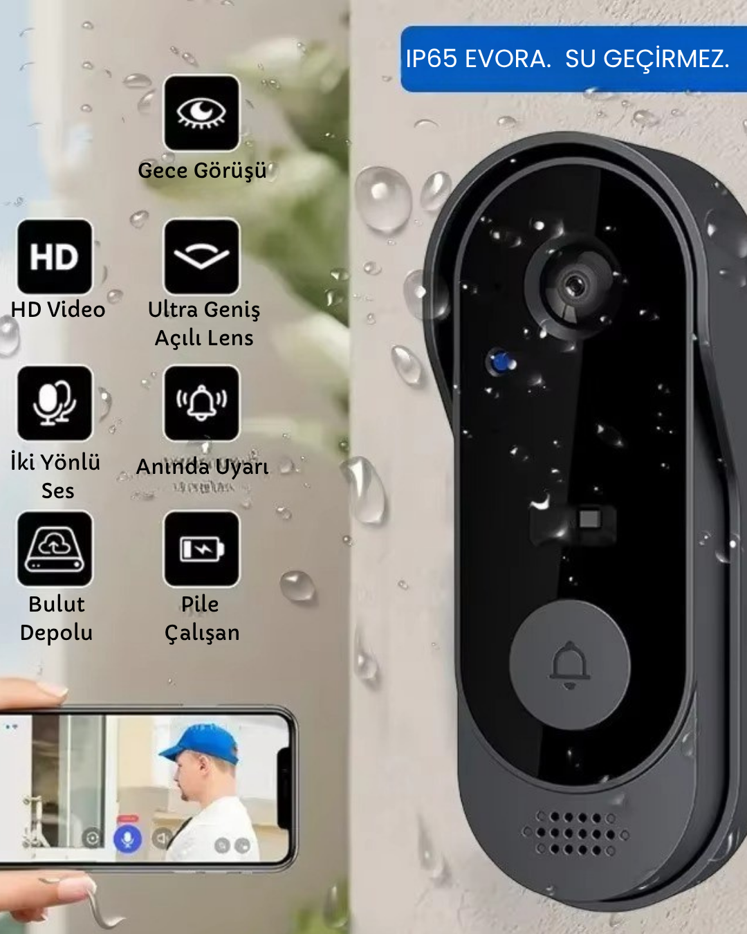 EVORA İle Önemli bir ziyaretçiyi veya paketi bir daha asla kaçırmayacaksınız ! Akılı Wi-Fi kapı zilimiz anında görüntülü görüşme ve çift yönlü konuşma imkanı sunar, Böylece kilometrelerce uzakta olsanız bile kapıyı açabilirsiniz.